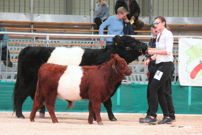 Erstmalig zur diesjährigen Galloway Open am 2. Mai 2015, veranstaltet von der Interessengemeinschaft Gallowayzüchter e.V. in Hessen, waren die Belted Galloway-Züchter eingeladen, ihre Tiere verstärkt zu präsentieren. Die Belted Galloway Interessengemeinschaft hatte die Show mit organisiert und die Preise dazu gesponsert. Außer den Siegern Mr., Mrs. und Miss Beltie Deutschland wurde auch als Highlight der 'beste Beltie' der Schau gekürt. Zugelassen zu diesen Wettbewerben waren ausschließlich Rinder, die mindestens 3 Generationen rein belted gezogen sind. Iain Finlay, Galloway-Züchter aus Schottland, hatte das Amt des Richters übernommen und durch die große Anzahl der gemeldeten Galloways, einfarbige, belted, white und riggit, viel zu tun. Aber er verrichtete seine Arbeit mit bewundernswerter Ruhe und Übersicht, und verlor dabei nie sein Konzept. Trotz einiger krankheitsbedingter Absagen war es alleine schon im Stall ein eindrucksvolles Bild, so viele Belted Galloways in einer Reihe nebeneinander stehen zu sehen. Die Züchter hatten ihre Tiere hervorragend für die Schau vorbereitet und zwei altersmäßig getrennte Färsenklassen machten den Anfang. In der jüngeren Gruppe errang Prinzessin vom Heidmoor von Michael Faust, Schlangenbad, gezogen von Rüdiger Stadus, Nehms, ein sehr langes Rind mit gutem Skelett, den ersten Platz. Aus dem gleichen Betrieb stammte auch die zweit platzierte sehr korrekte red belted Färse Luisa. Den dritten Platz belegte Julischka vom Rennsteig von Steffi Heller, die in der Entwicklung nicht ganz mit den beiden vor ihr platzierten mithalten konnte. Die Siegerin der älteren Klasse, Lieke vom Rennsteig, Züchter und Besitzer Steffi Heller, Eisenach, gefiel durch ihre ausgeprägte Tiefe und typvoller Ausstrahlung und ihr wurde später auch der Titel Miss Beltie Deutschland zugesprochen. Zur Reservesiegerin wurde die zweitplatzierte dieser Klasse gekürt. Anna von Lindenhof, vorgestellt von Manfred Möller, Weimar, überzeugte durch ihre Rassequalität und korrektem Exterieur. Den dritten Platz belegte die viel versprechende Katy vom Lindenhof von Carsten Haalck, Linden. Es folgten 4 Belted Kühe mit ihren quicklebendigen Kälbern bei Fuß. Die Siegerin und Mrs. Beltie Deutschland, übrigens eine Halbschwester mit derselben Mutter der Siegerfärse Lieke, Südtondern's Line, vorgestellt von Carsten Haalck, Linden, Züchter Maria & Remmer Rieken, Süderlügum, wusste mit ihrem Rassetyp, ihrer Breite und Tiefe voll zu punkten. Außerdem bewies ihr hervorragend entwickeltes 8 Monate altes Kuhkalb ihre Zuchtqualität. Reservesiegerin wurde die aus dem Betrieb von Tamara u. Friedr.-W. Frank, Bad Laasphe, stammende erst knapp 4 jährige Lynn vom Rothaarsteig. Sie führte ihr erstes Kalb, ein vielversprechendes Bullkalb, von dem für die Zukunft einiges zu erwarten ist. Aufgrund ihrer Vorzüge in Körperbau und Fundament verwies sie Martha vom Lindenhof von Manfred Möller, Weimar auf den 1c Platz. Große Aufmerksamkeit in der Bullenklasse erhielt der Sieger und Mr. Beltie Deutschland Diego vom Apenberg, aus der Zucht von Wilhelm Riechers, Detmold durch seine Vorzüge in Typ, Körperbau und Fleischansatz. Damit konnte er sich gegen den über ein Jahr älteren Jodok vom Altrhein von Manfred Möller, Weimar, durchsetzen und verwies diesen als Reservesieger auf den 1b-Platz. Der bestens vorbereitete Danny 2 vom Walsen von Dieter Boies, Barnstorf, gefiel durch seine rote Farbe, aber seine Bemuskelung und sein Fundament konnte nicht mit den vor ihm stehenden Bullen mithalten. Nach den Präsentationen folgte die Gesamtsiegerauswahl. Dazu traten der Sieger-Bulle, die -Kuh und -Färse zum Vergleich an. Das Publikum wartete gespannt auf die Entscheidung vom Richter Iain Finlay, der nach nochmaliger Musterung die Kuh Südtondern's Line zum 'Besten Beltie 2015' kürte. Maria & Remmer Rieken , früher selber Beltie-Züchter, hatten den Wanderpreis dazu gestiftet und ließen es sich nicht nehmen, diesen selber an Carsten Haalck zu übergeben.